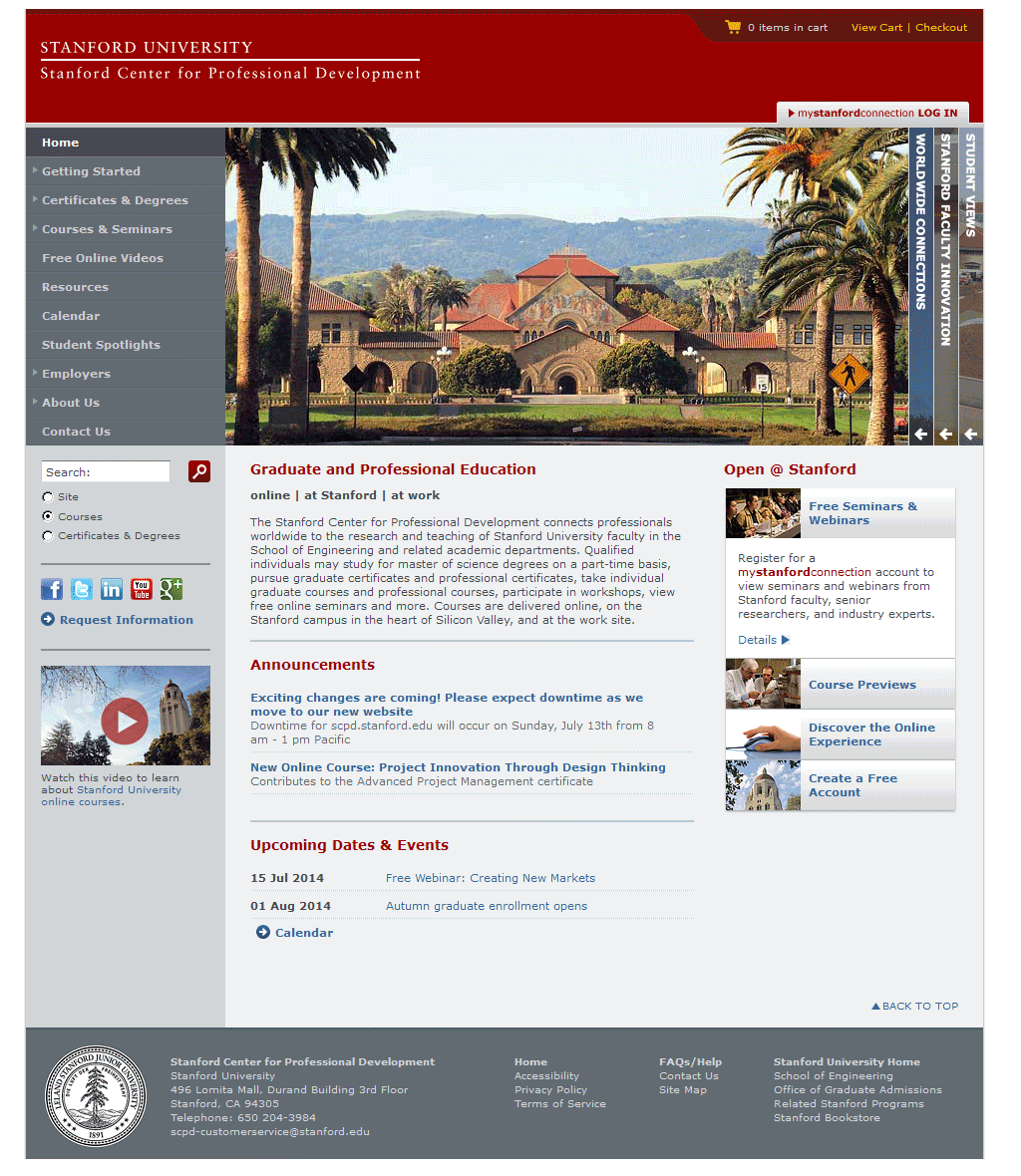 The first impression that people have of an organization is often made through their web presence. Expectations are high for visitors to SCPD sites, typically very smart engineers hoping to improve their careers through Stanford engineering education. I took ownership of meeting those expectations and making a positive first impression.